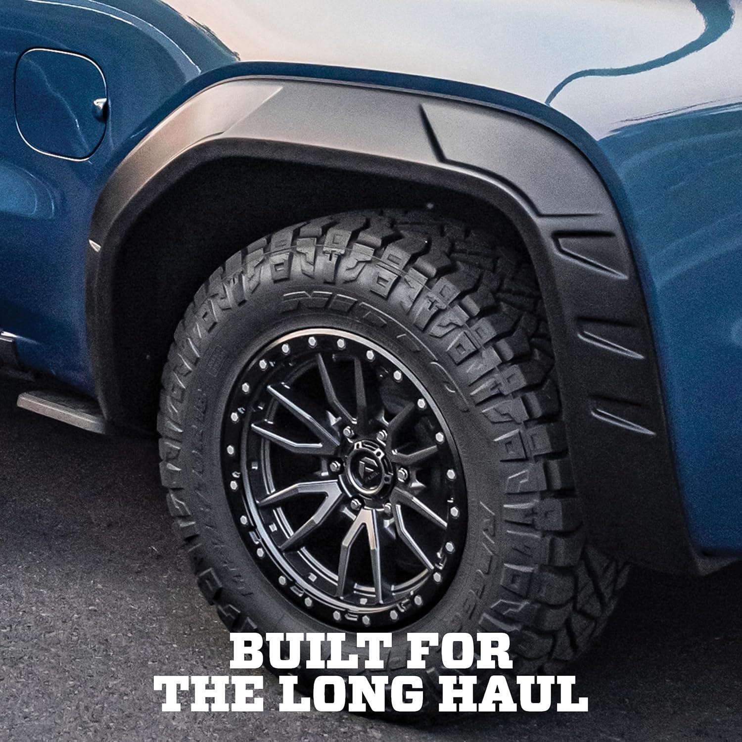 FOR WHATEVER YOUR TIRE KICKS UP — Hit any kind of road you want when these extra-tough flares are on the job. Built-in protection for your fenders and rockers with aggressive vented design when you’re running extra-wide tires.